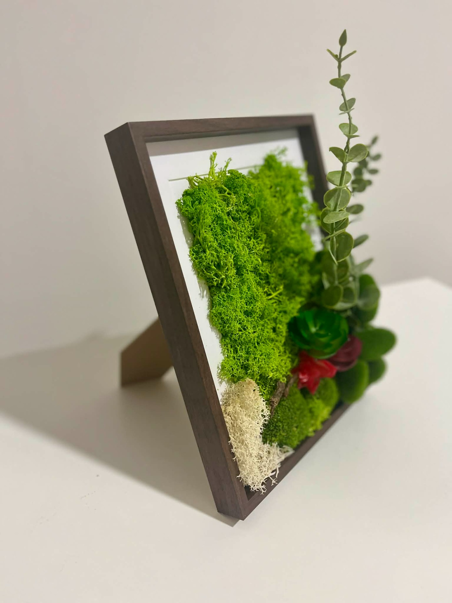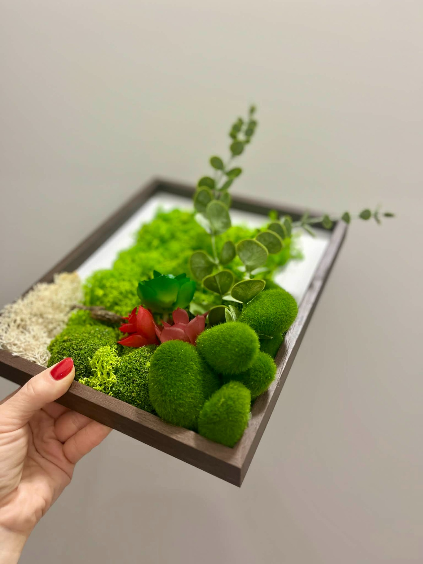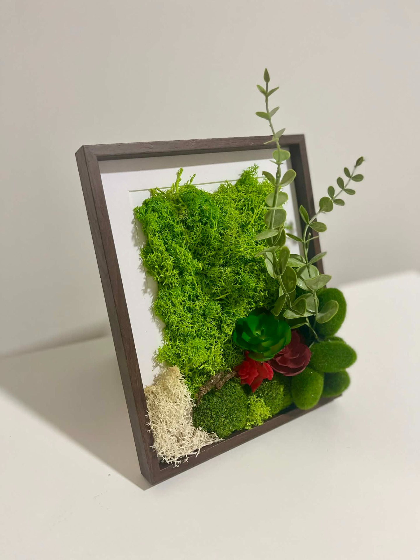 Tento ručně vyráběný obraz v rozměru 22 × 26 cm kombinuje kvalitní stabilizovaný mech, pečlivě vybrané umělé sukulenty, mechové koule a jemné přírodní prvky. ¨