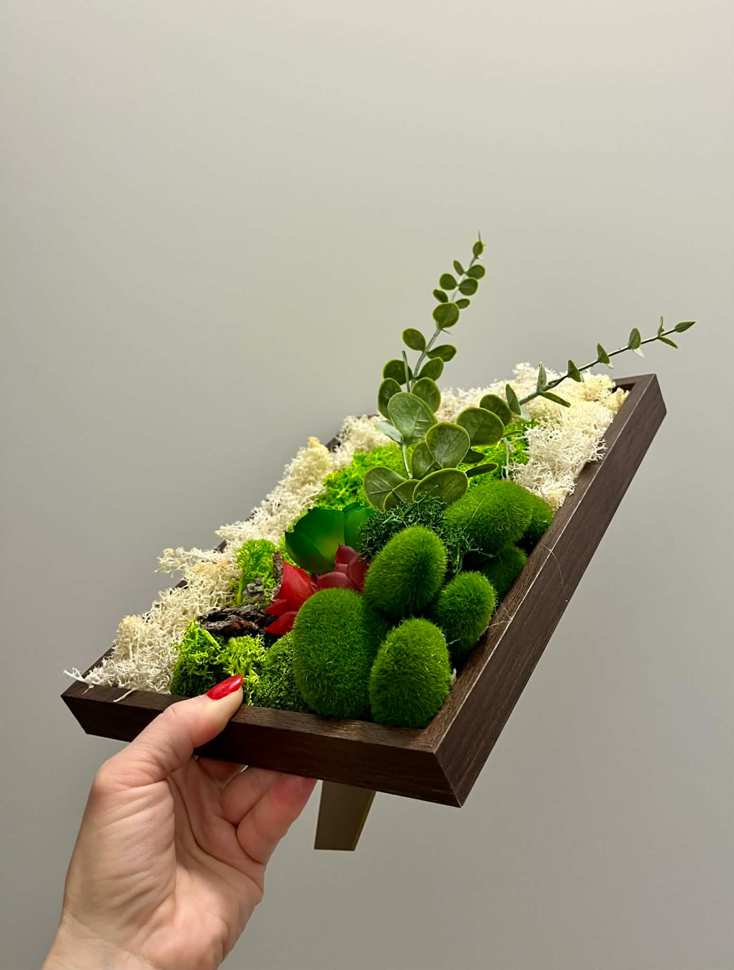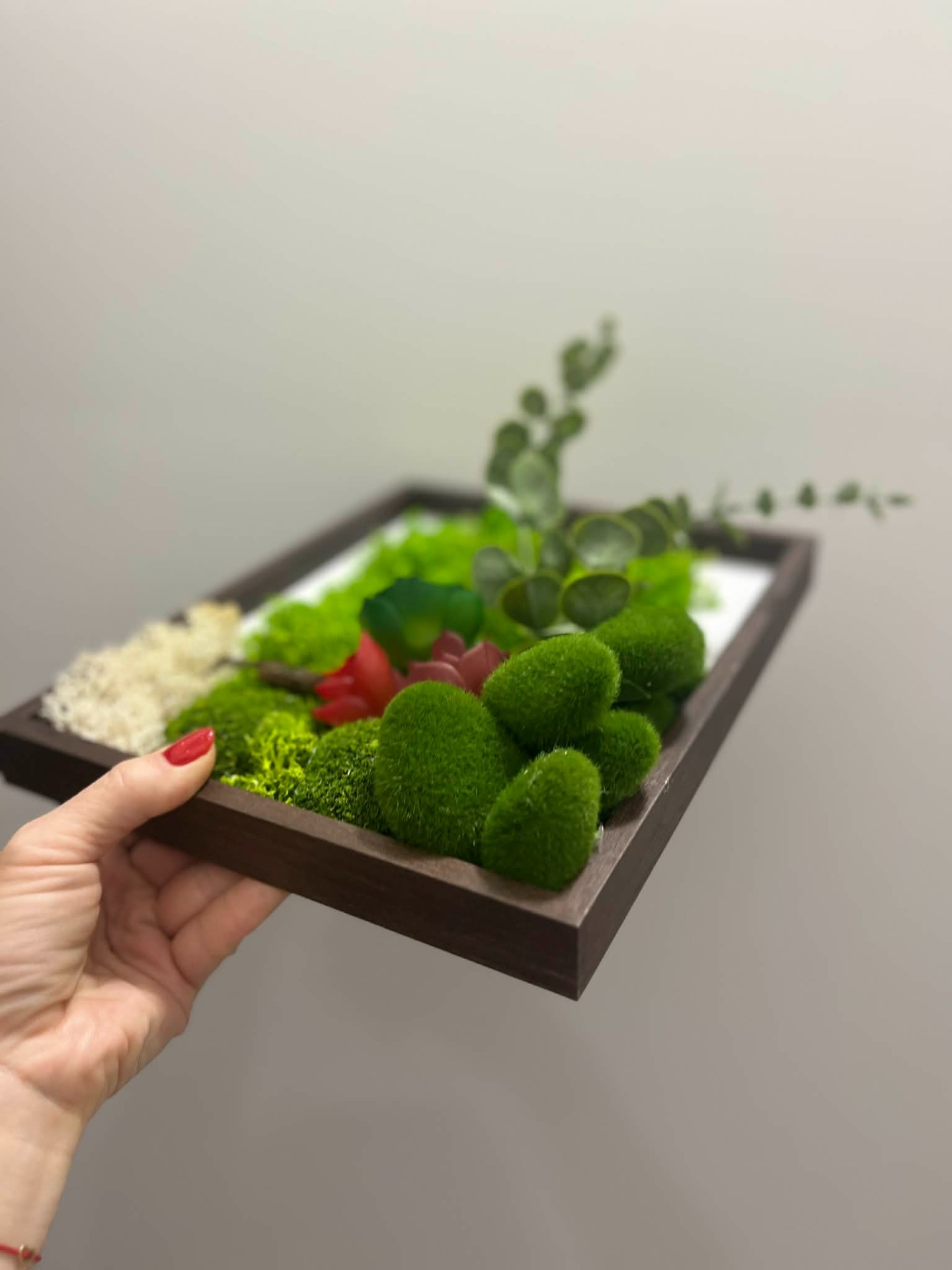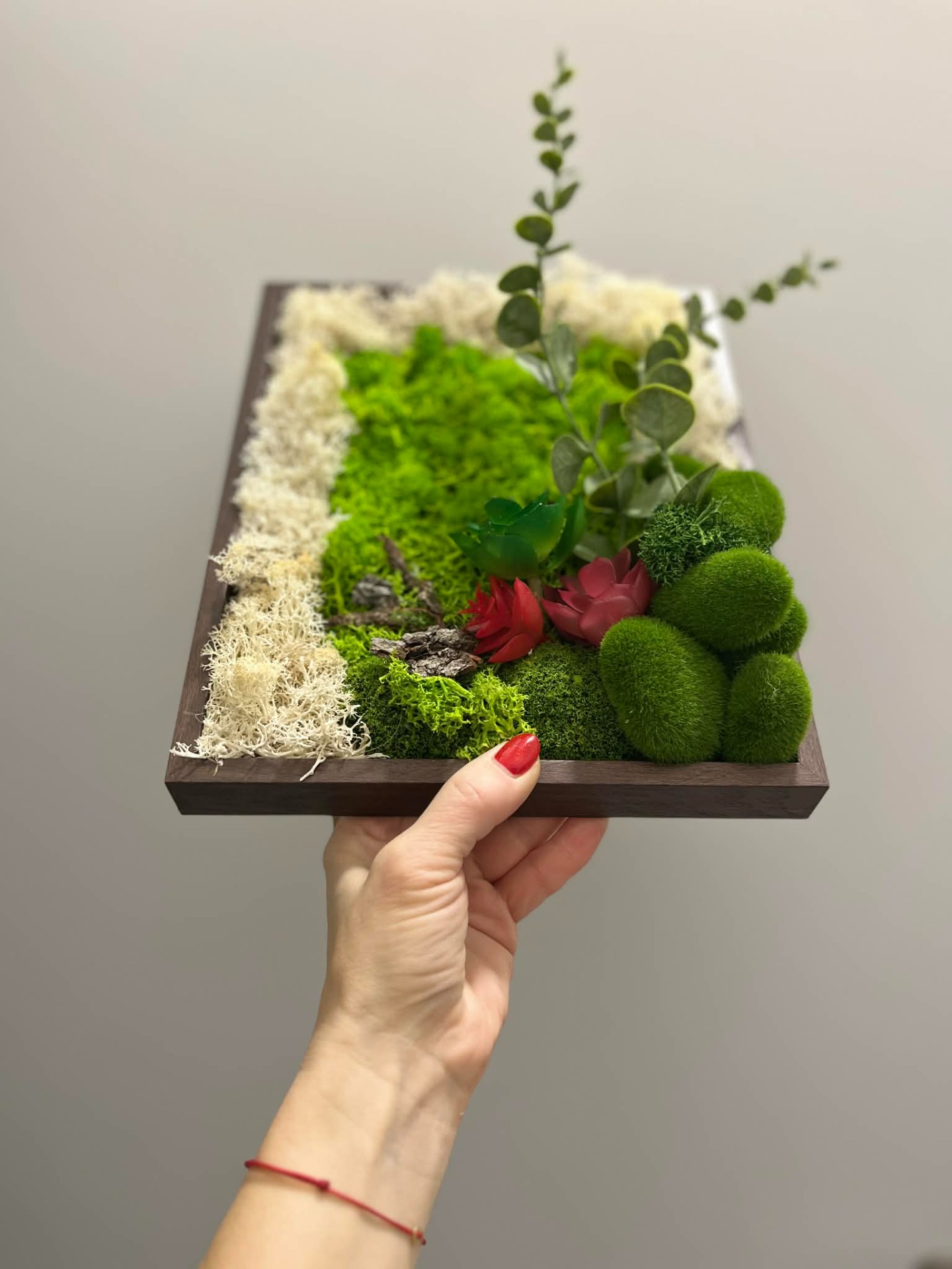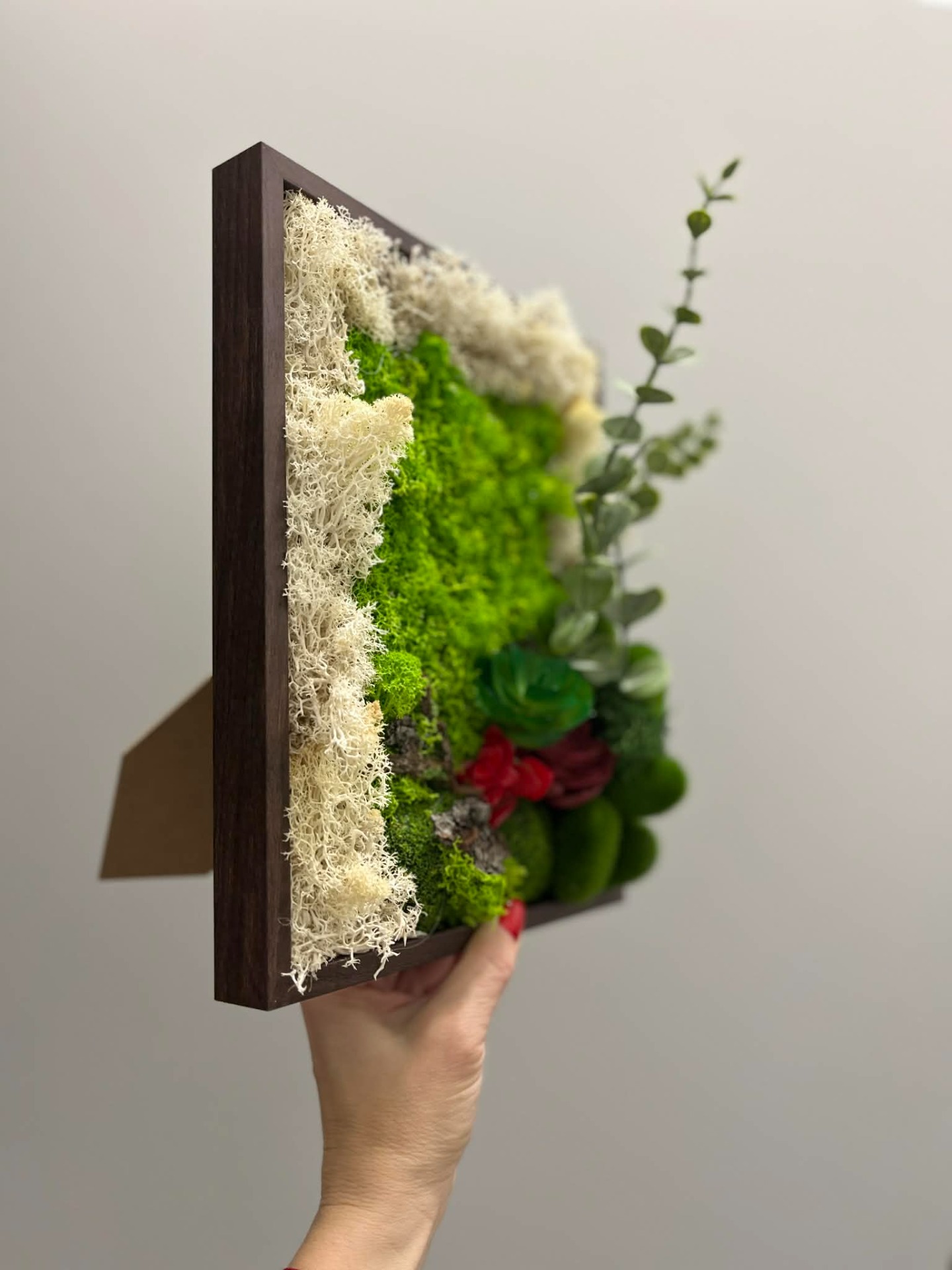 Tento ručně vyráběný obraz v rozměru 22 × 26 cm kombinuje kvalitní stabilizovaný mech, pečlivě vybrané umělé sukulenty, mechové koule a jemné přírodní prvky. ¨